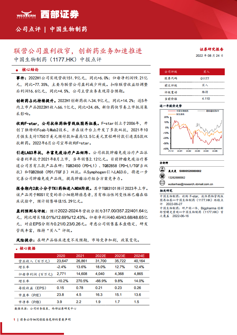 中国生物制药(01177):联营公司盈利收窄,创新药业务加速推进