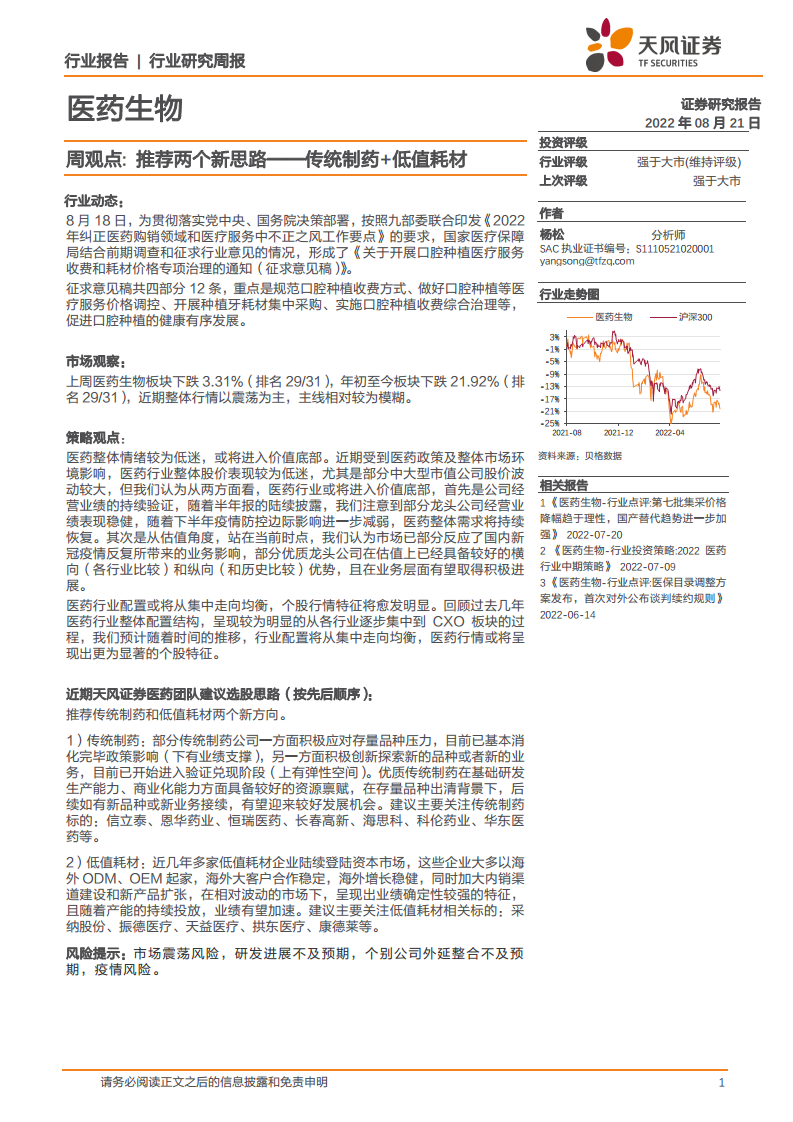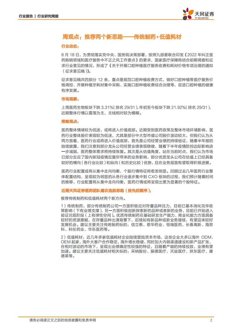 医药生物周观点:推荐两个新思路——传统制药+低值耗材