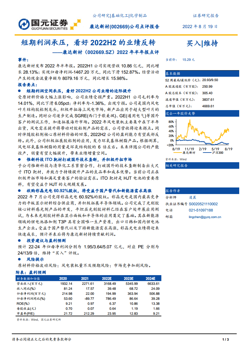 康达新材(002669):短期利润承压,看好2022H2的业绩反转