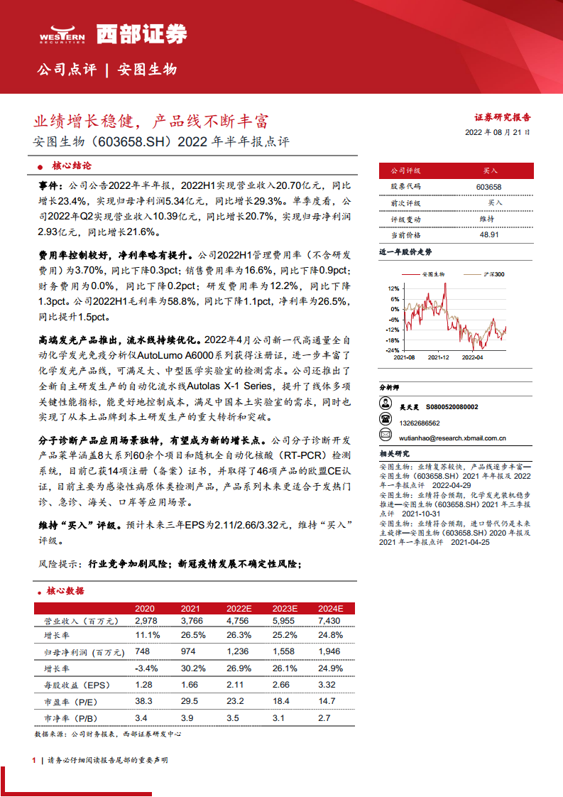 安图生物(603658)2022年半年报点评:业绩增长稳健,产品线不断丰富