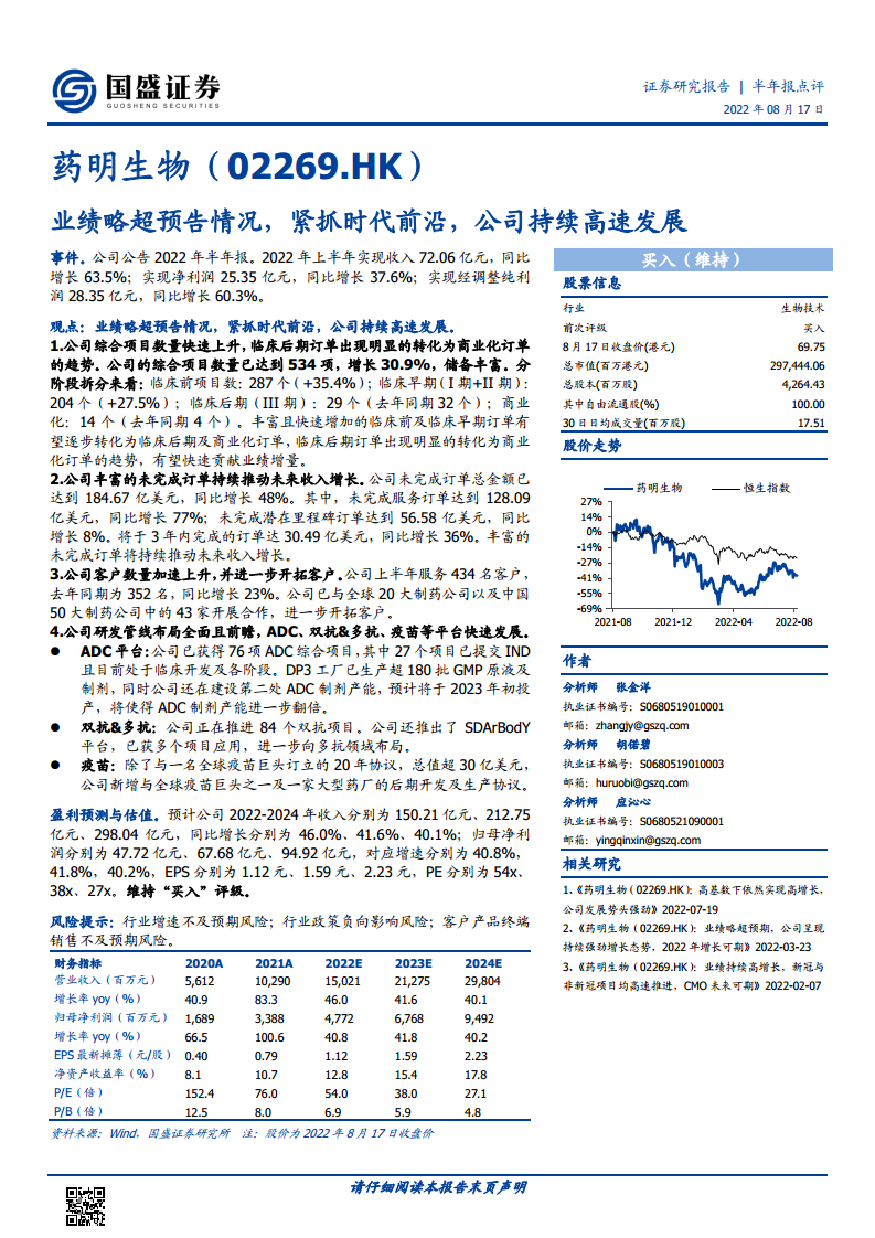 药明生物(02269):业绩略超预告情况,紧抓时代前沿,公司持续高速发展