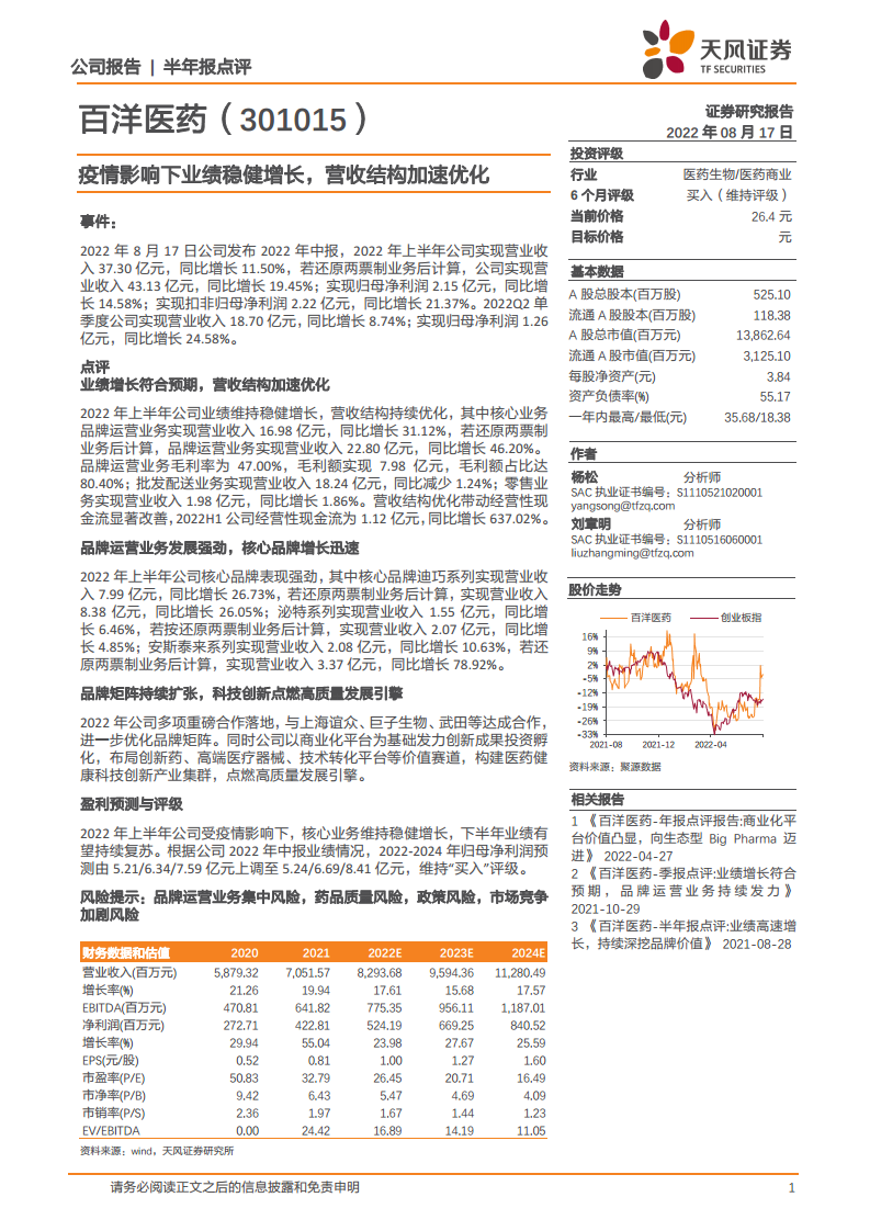 百洋医药(301015):疫情影响下业绩稳健增长,营收结构加速优化
