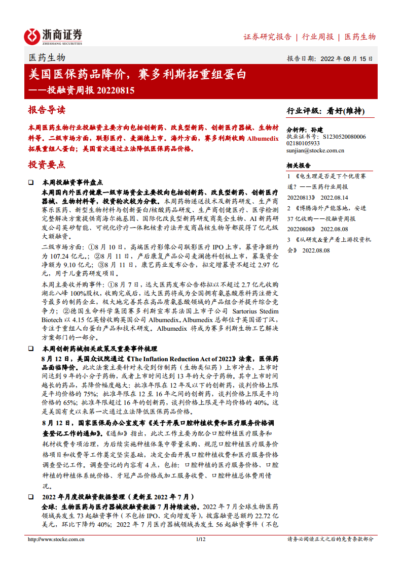 医药生物行业投融资周报:美国医保药品降价,赛多利斯拓重组蛋白
