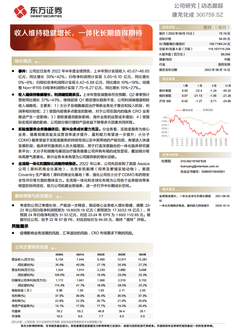 康龙化成(300759):收入维持稳健增长,一体化长期值得期待