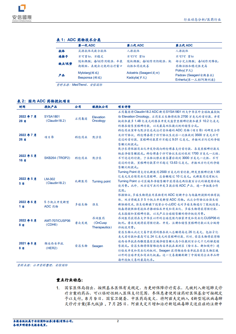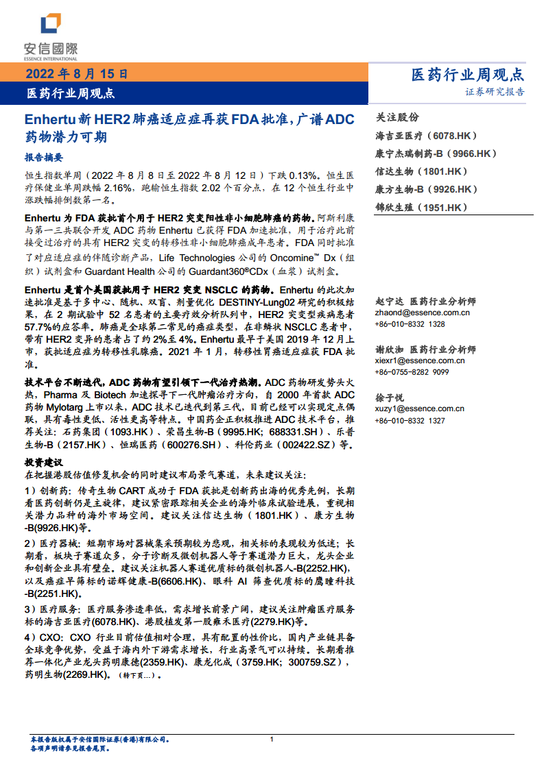 医药行业周观点:Enhertu新HER2肺癌适应症再获FDA批准,广谱ADC药物潜力可期