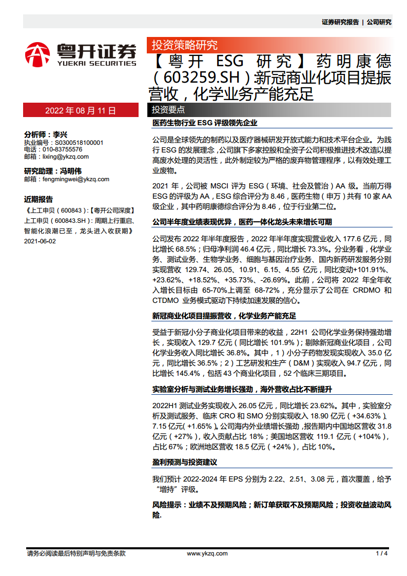药明康德:新冠商业化项目提振营收,化学业务产能充足