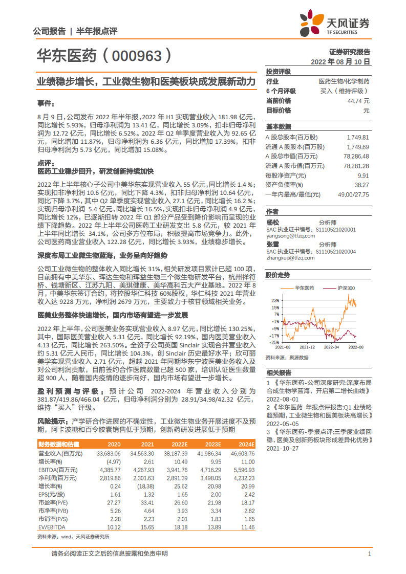 华东医药(000963):业绩稳步增长,工业微生物和医美板块成发展新动力