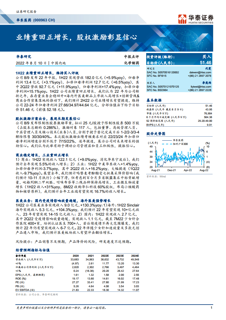 华东医药(000963):业绩重回正增长,股权激励彰显信心