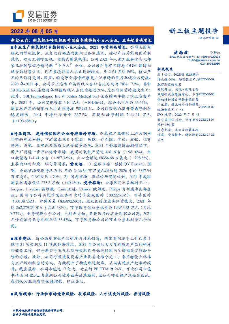 新松医疗:制氧机和呼吸机医疗器械专精特新小巨人企业,业务起量快增长
