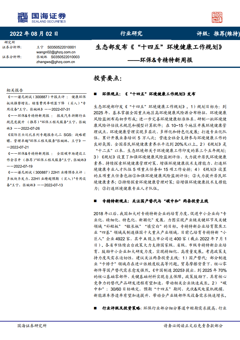 环保&专精特新周报:生态部发布《“十四五”环境健康工作规划》