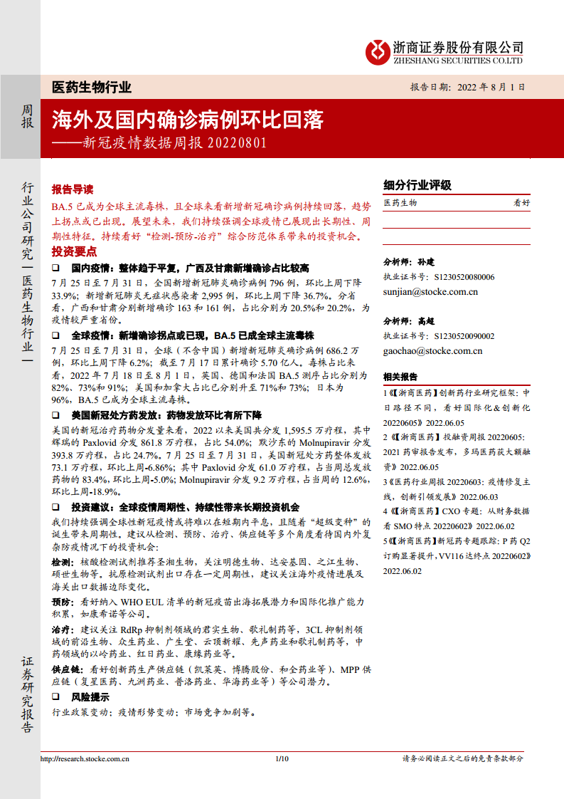 医药生物行业新冠疫情数据周报:海外及国内确诊病例环比回落