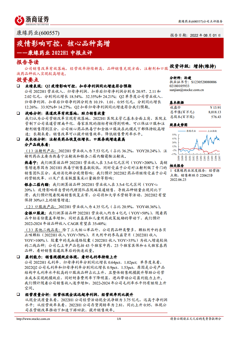 康缘药业2022H1中报点评:疫情影响可控,核心品种高增