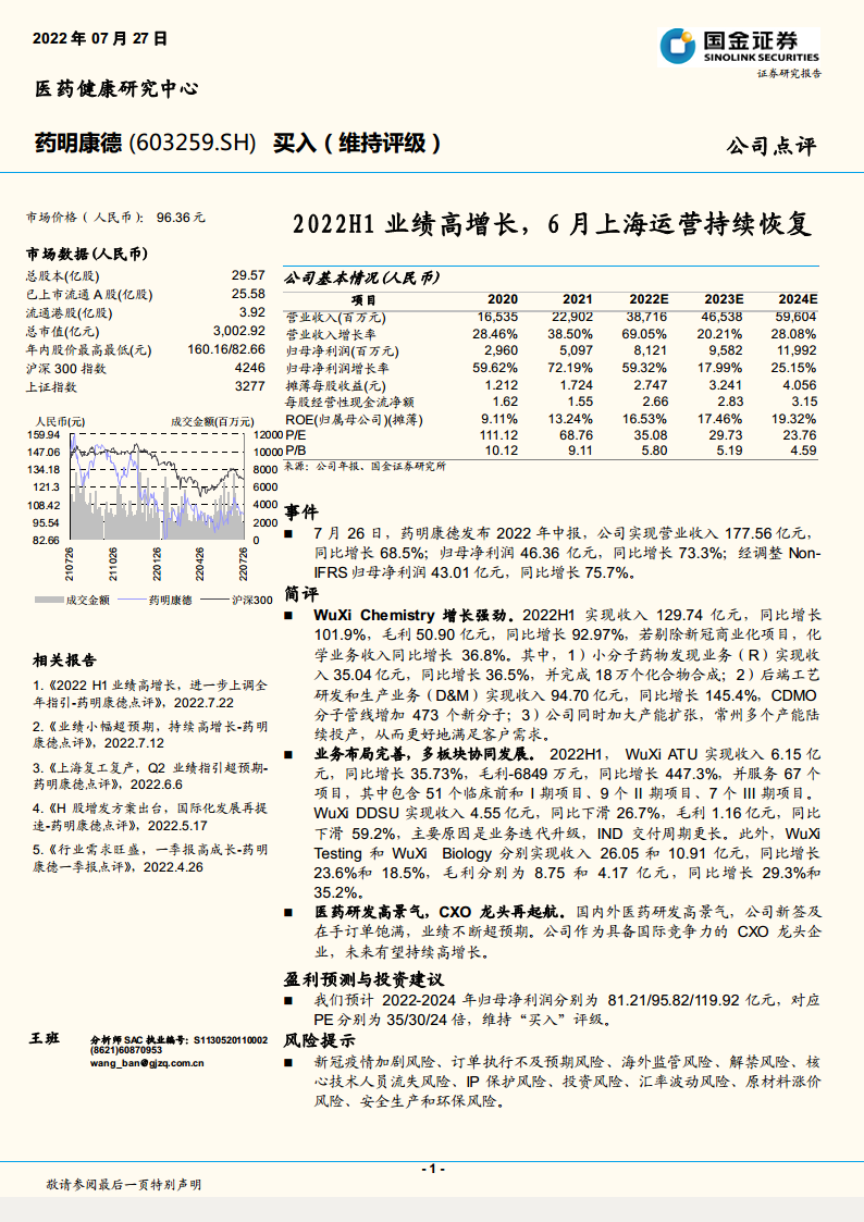 药明康德(603259):2022H1业绩高增长,6月上海运营持续恢复