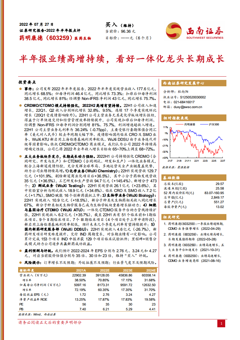 药明康德(603259):半年报业绩高增持续,看好一体化龙头长期成长