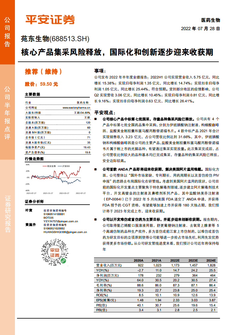 苑东生物(688513):核心产品集采风险释放,国际化和创新逐步迎来收获期