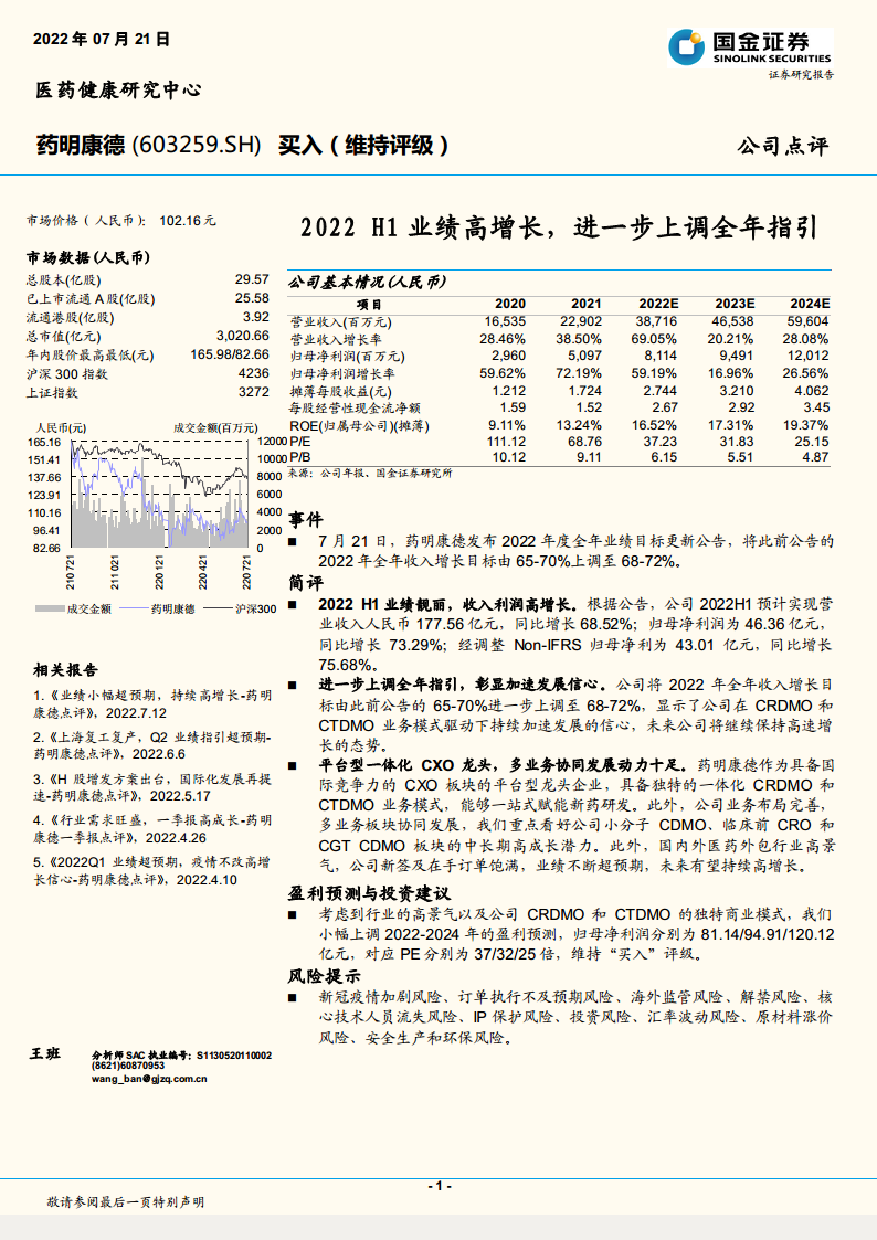 药明康德(02359):2022 H1业绩高增长,进一步上调全年指引