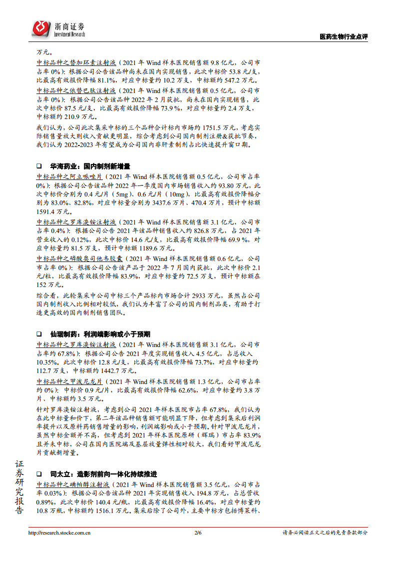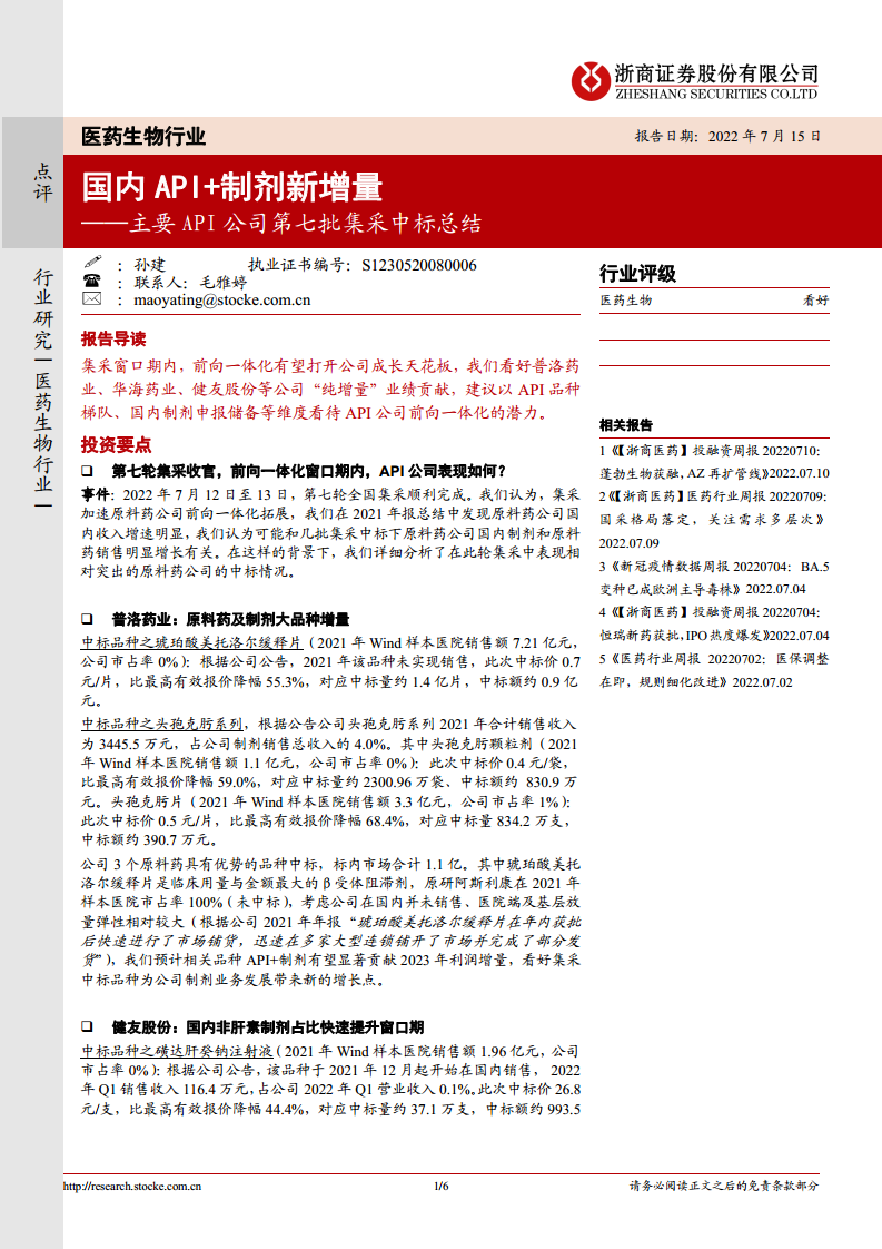 医药生物行业:主要API公司第七批集采中标总结──国内API+制剂新增量