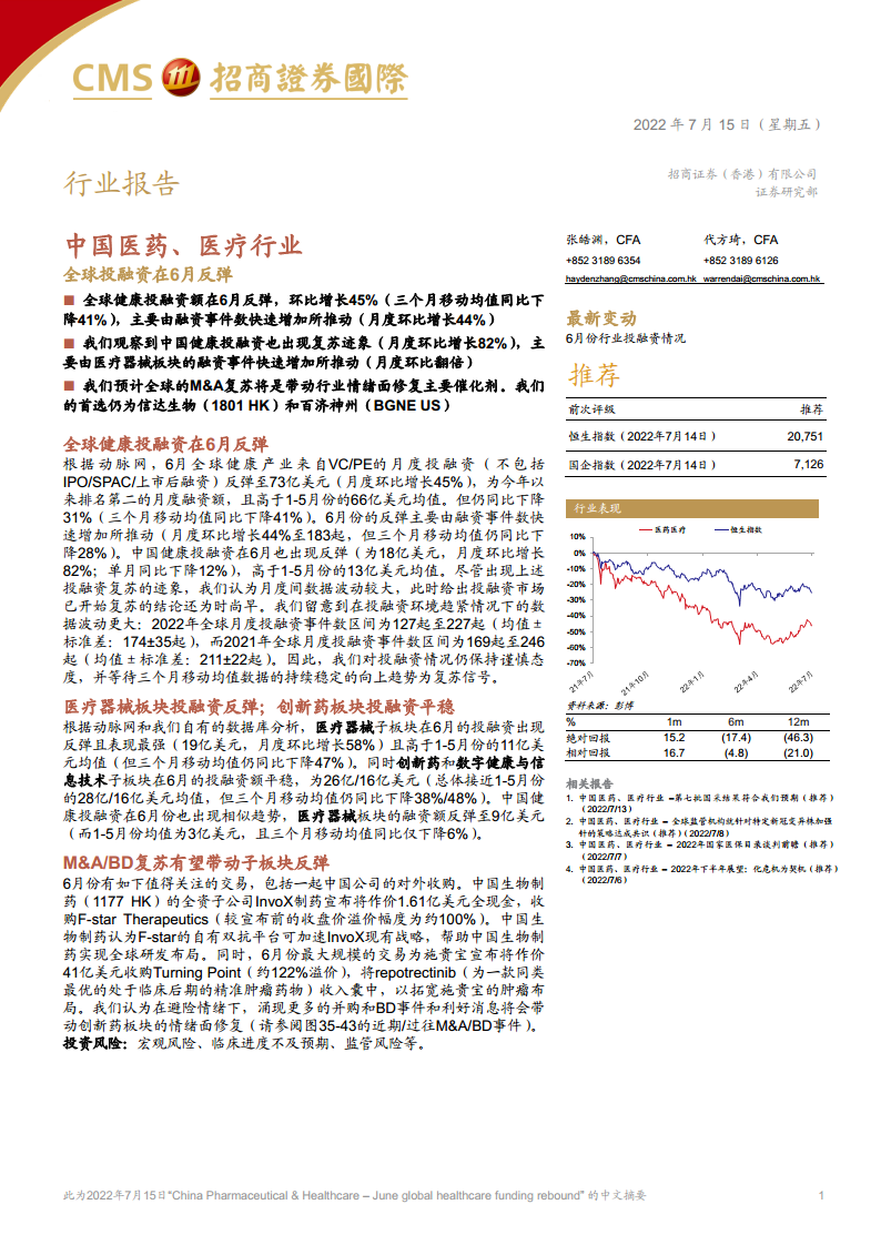 中国医药、医疗行业:全球投融资在6月反弹
