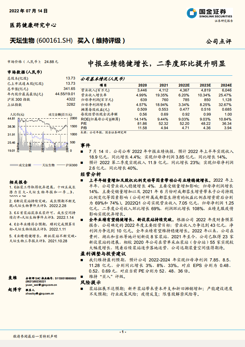 天坛生物(600161):中报业绩稳健增长,二季度环比提升明显