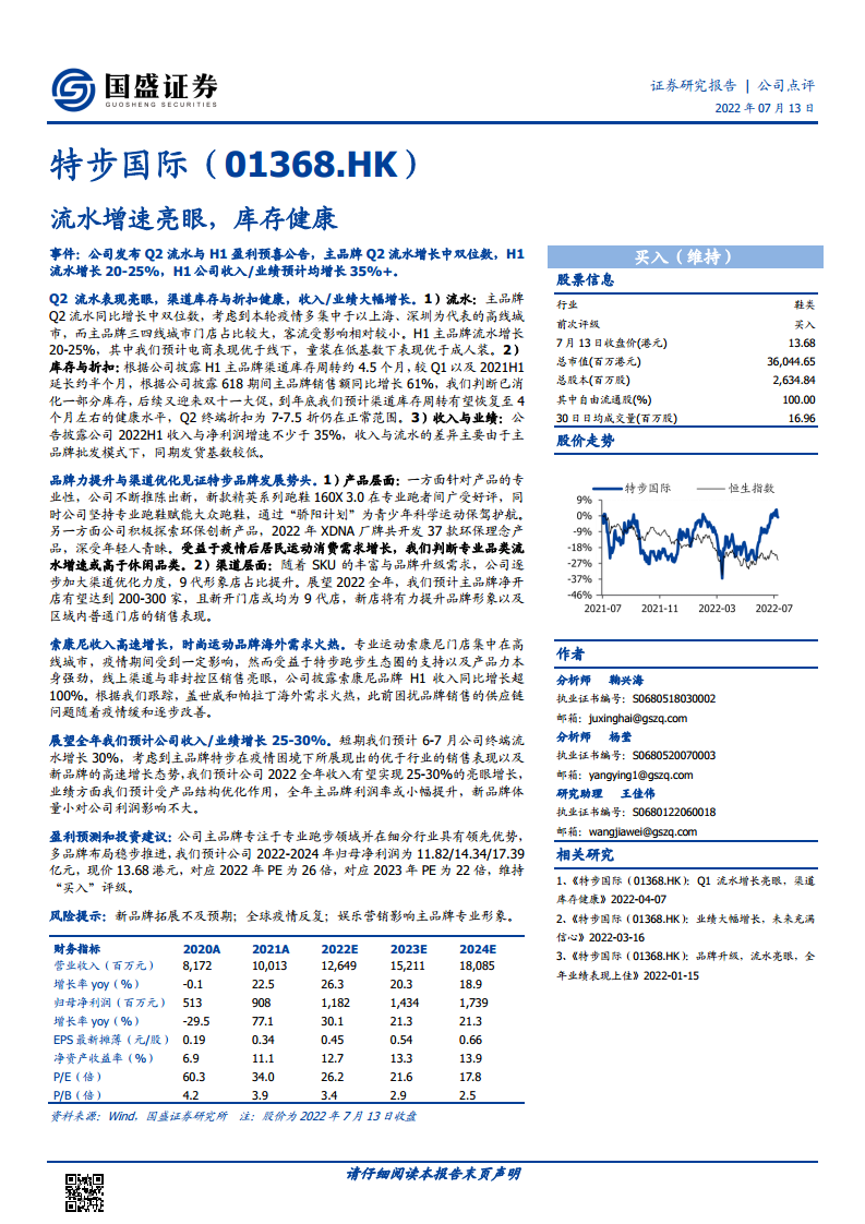 特步国际(01368):流水增速亮眼,库存健康