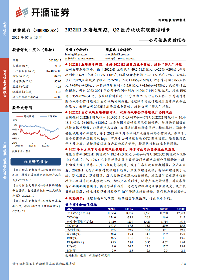 公司信息更新报告:2022H1业绩超预期,Q2医疗板块实现翻倍增长