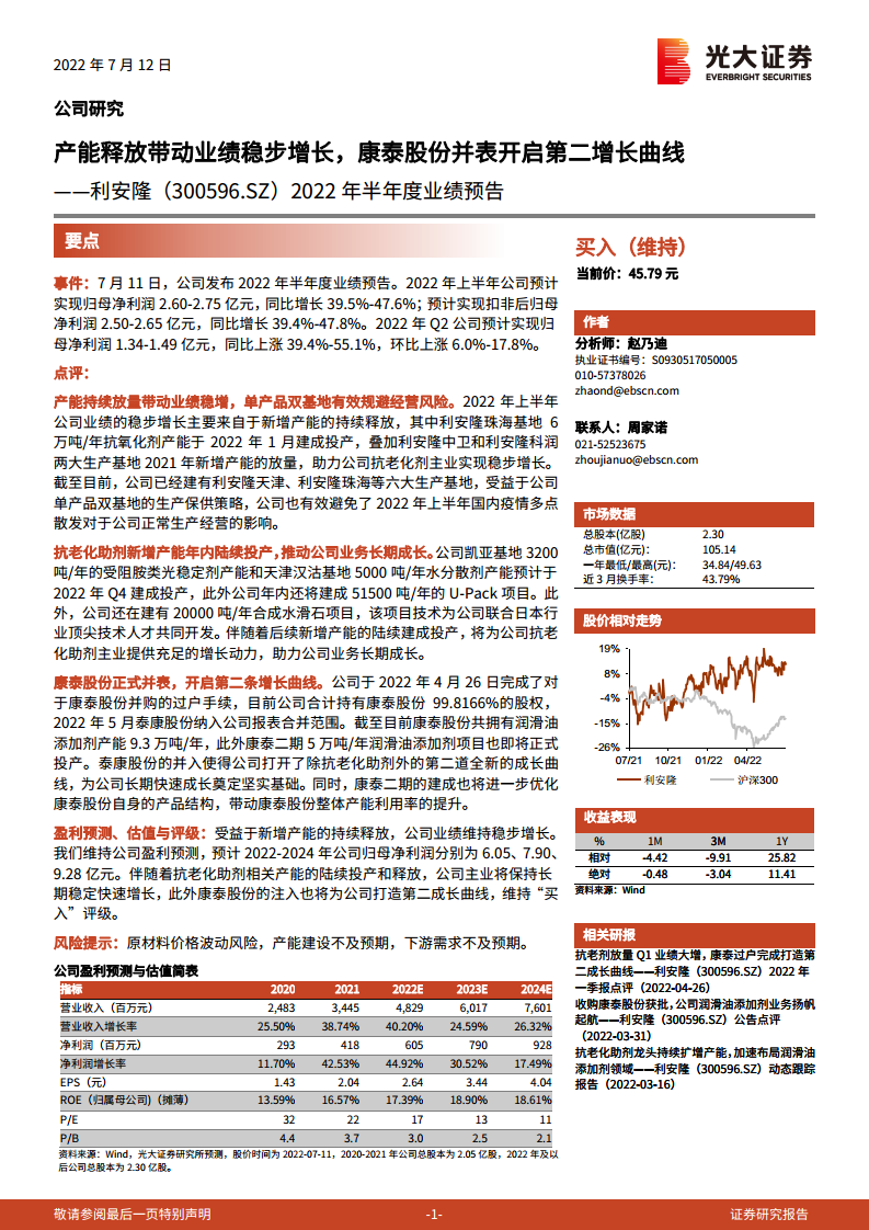 利安隆(300596):产能释放带动业绩稳步增长,康泰股份并表开启第二增长曲线