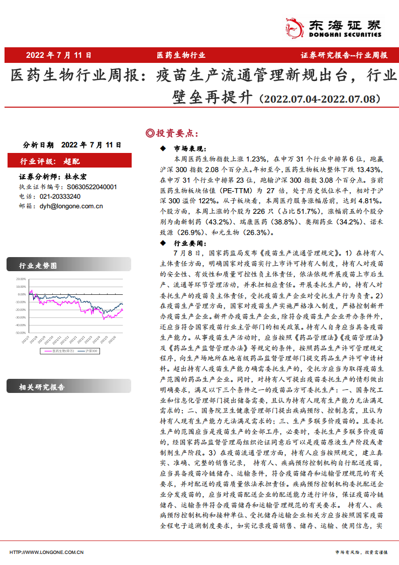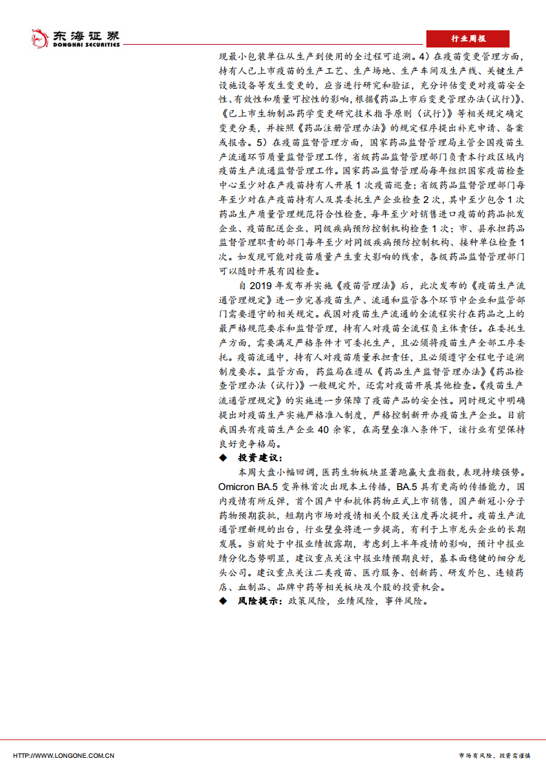 医药生物行业周报:疫苗生产流通管理新规出台,行业壁垒再提升