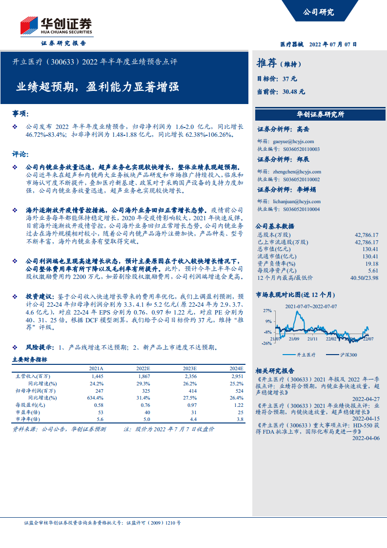 开立医疗(300633)2022年半年度业绩预告点评:业绩超预期,盈利能力显著增强