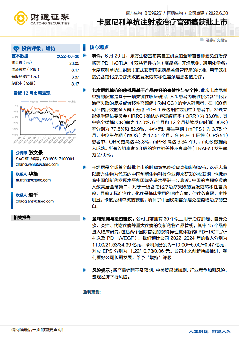 康方生物-B(09926):卡度尼利单抗注射液治疗宫颈癌获批上市