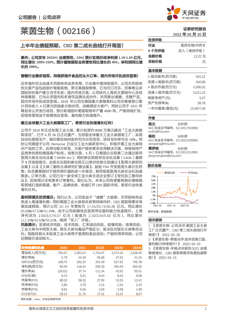 莱茵生物(002166):上半年业绩超预期,CBD第二成长曲线打开局面