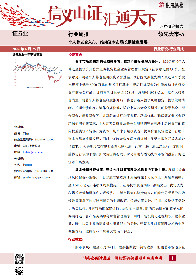证券业行业周报:个人养老金入市,推动资本市场长期健康发展