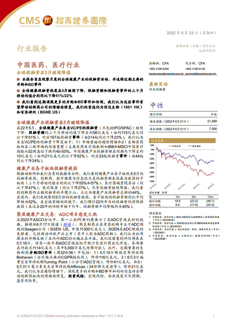 中国医药、医疗行业:全球投融资在5月继续降温
