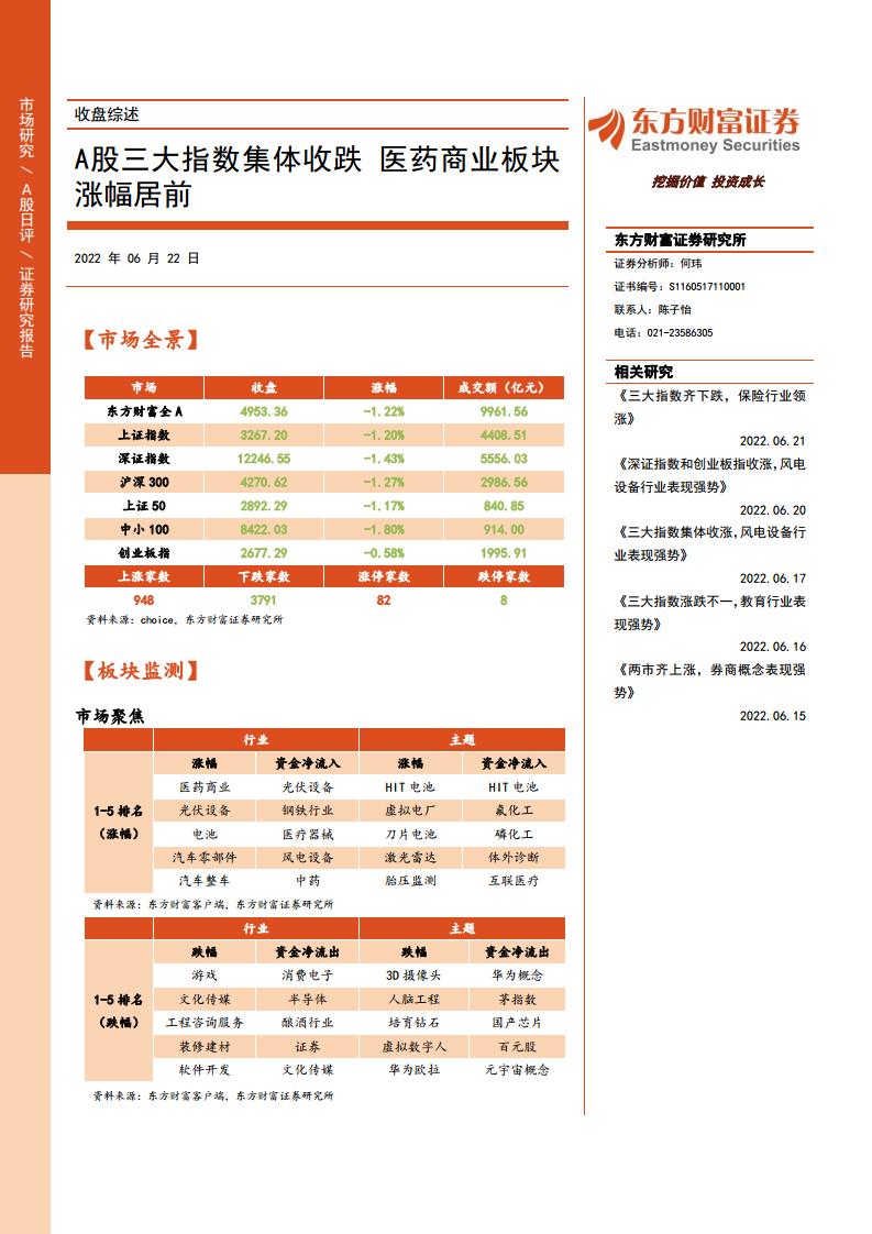A股三大指数集体收跌,医药商业板块涨幅居前