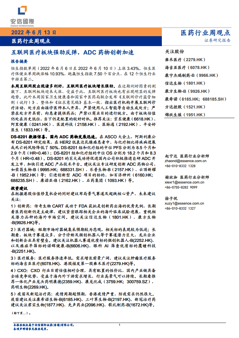 医药行业周观点:互联网医疗板块强劲反弹,ADC药物创新加速