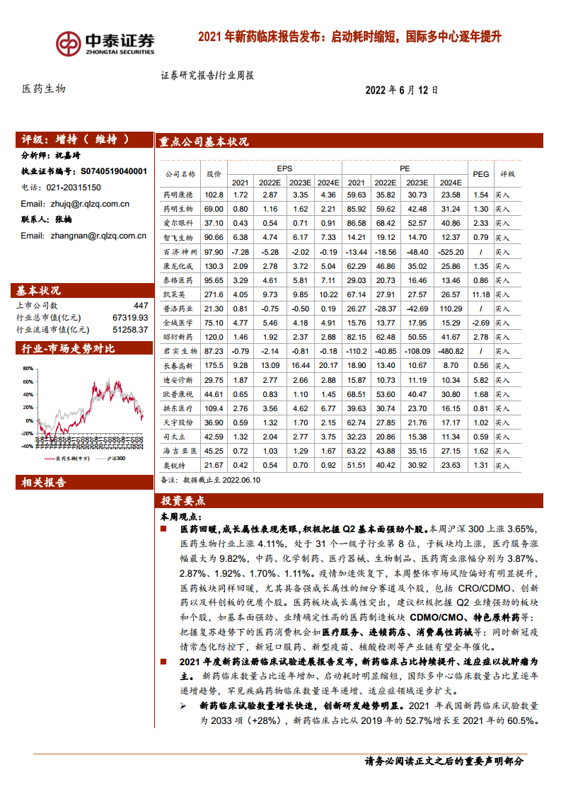 医药生物行业周报:2021年新药临床报告发布:启动耗时缩短,国际多中心逐年提升