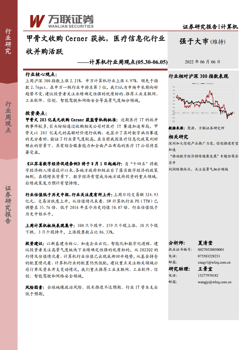 计算机行业周观点:甲骨文收购Cerner获批,医疗信息化行业收并购活跃