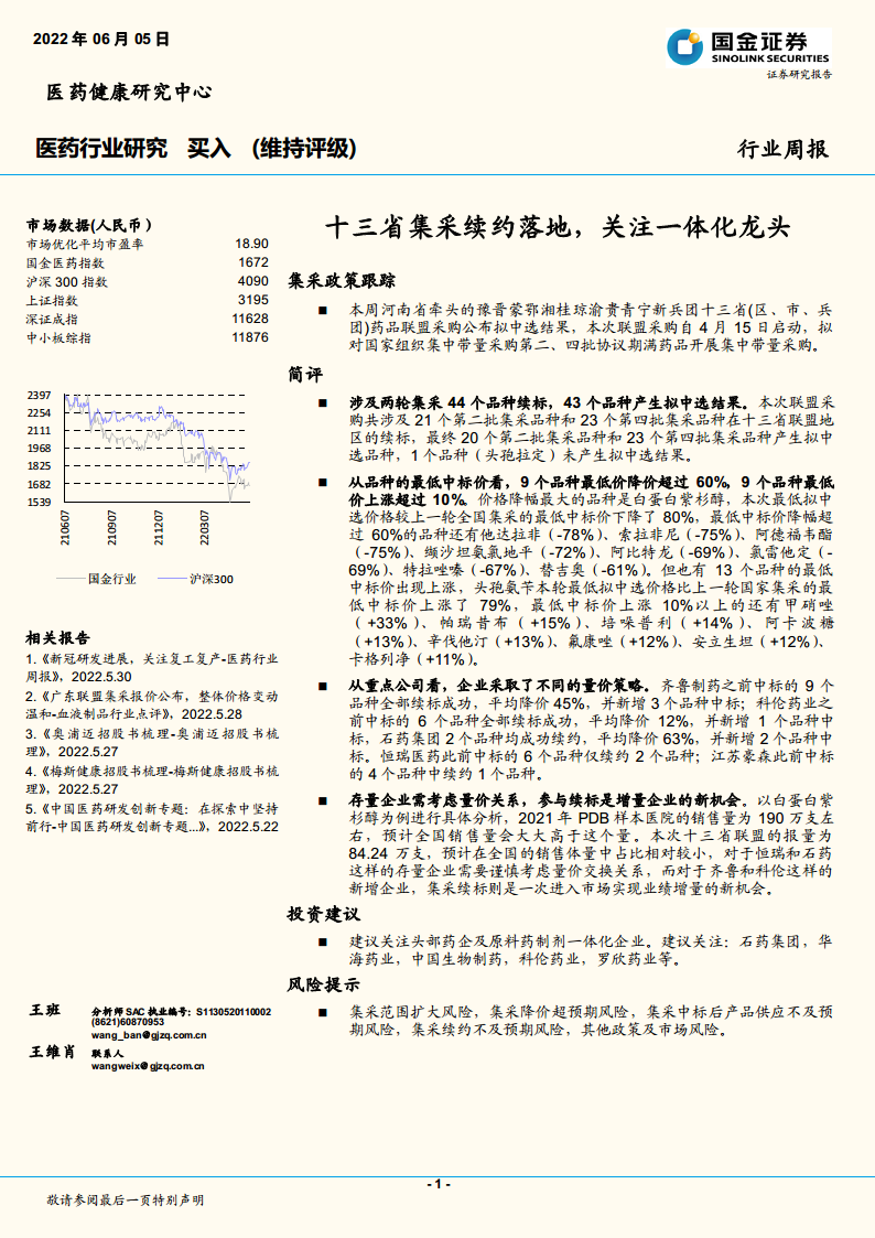 医药行业研究:十三省集采续约落地,关注一体化龙头