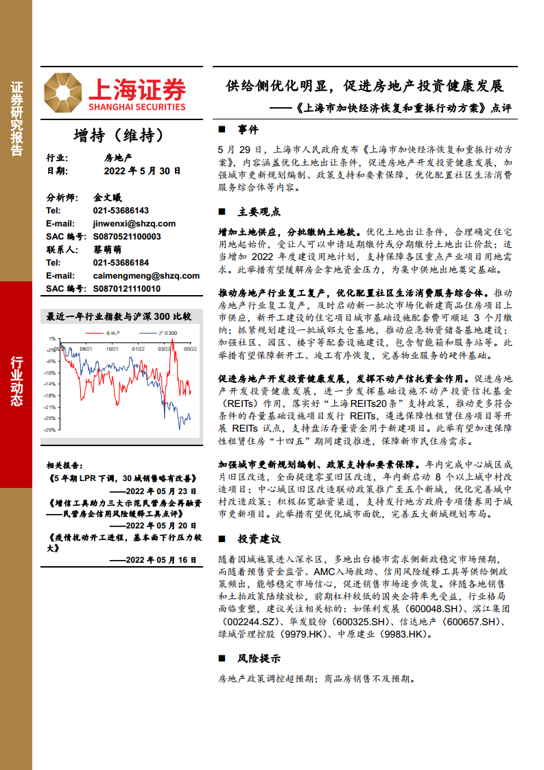 房地产《上海市加快经济恢复和重振行动方案》点评:供给侧优化明显,促进房地产投资健康发展