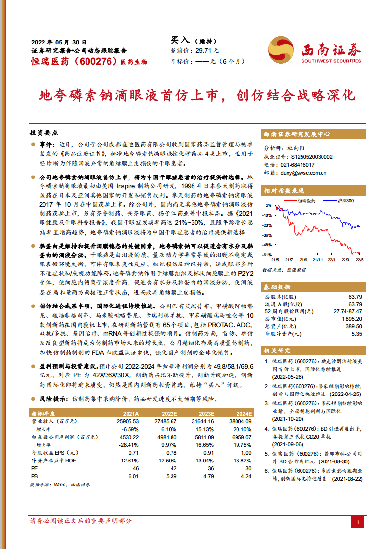 恒瑞医药(600276):地夸磷索钠滴眼液首仿上市,创仿结合战略深化