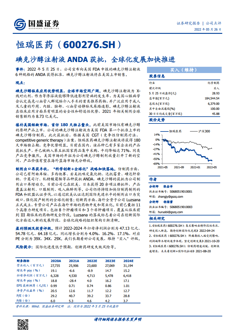 恒瑞医药(600276):碘克沙醇注射液ANDA获批,全球化发展加快推进