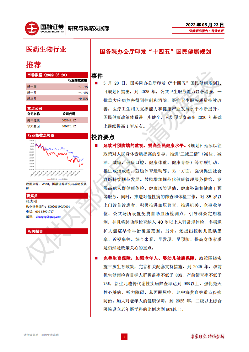 医药生物行业:国务院办公厅印发“十四五”国民健康规划