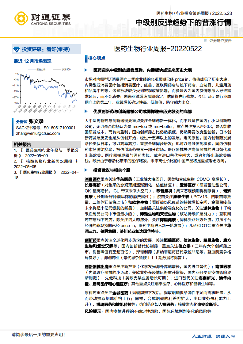 医药生物行业周报:中级别反弹趋势下的普涨行情