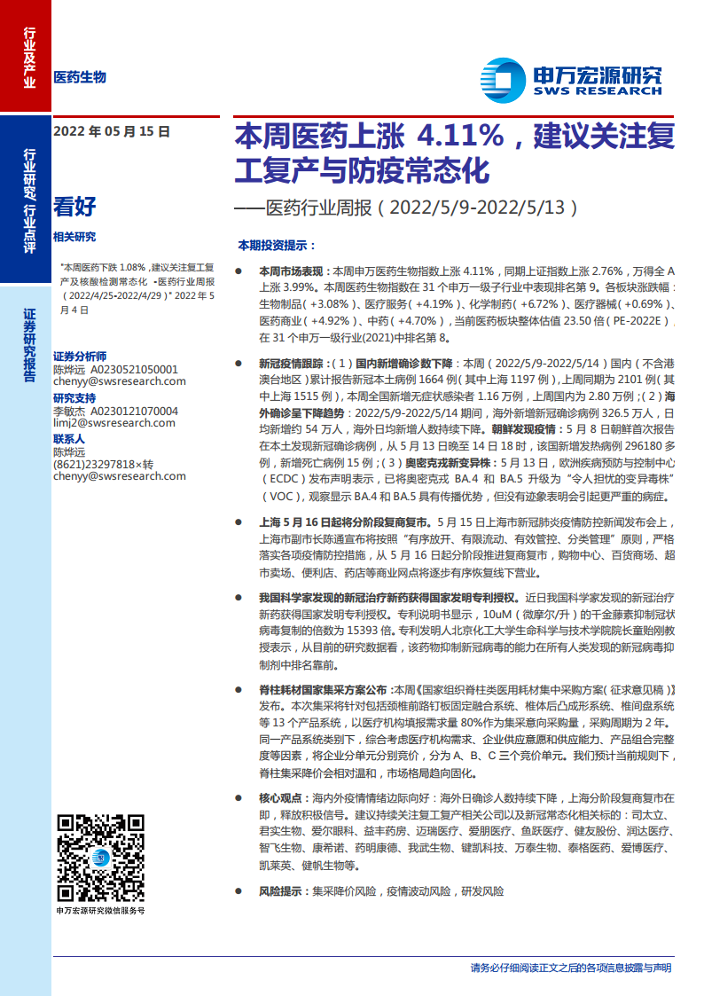医药行业周报:本周医药上涨4.11%,建议关注复工复产与防疫常态化