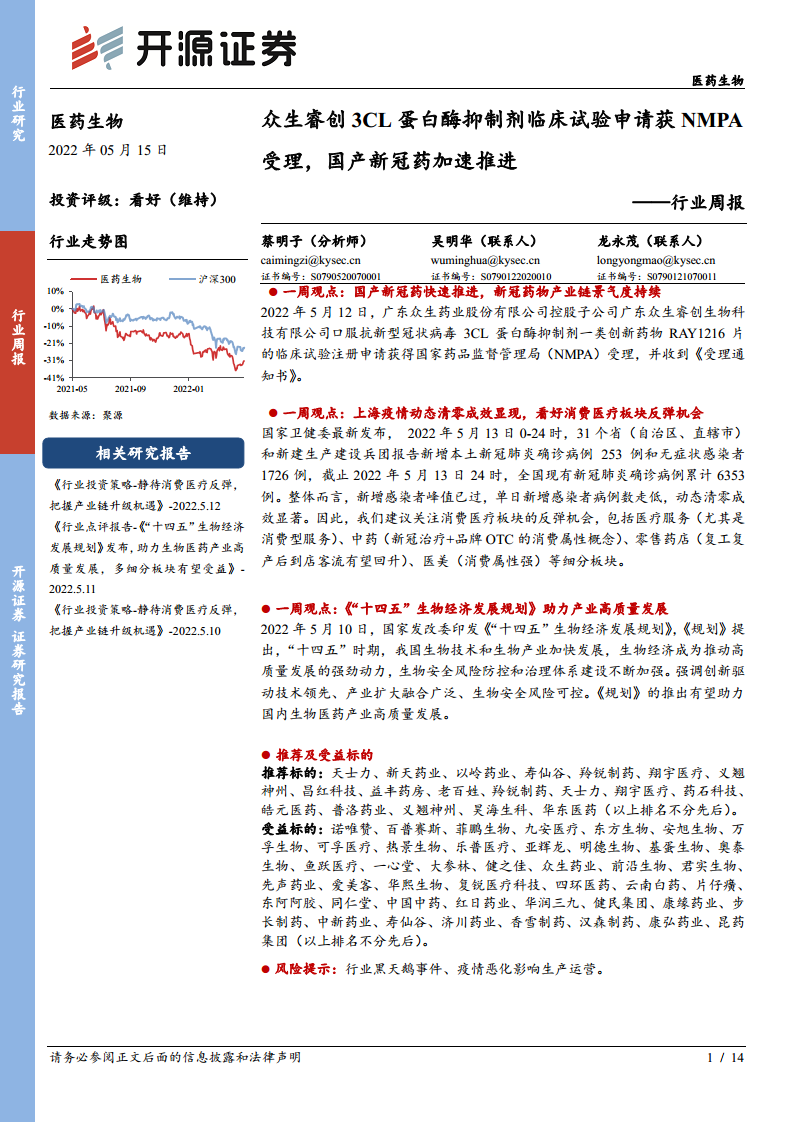 医药生物行业周报:众生睿创3CL蛋白酶抑制剂临床试验申请获NMPA受理,国产新冠药加速推进