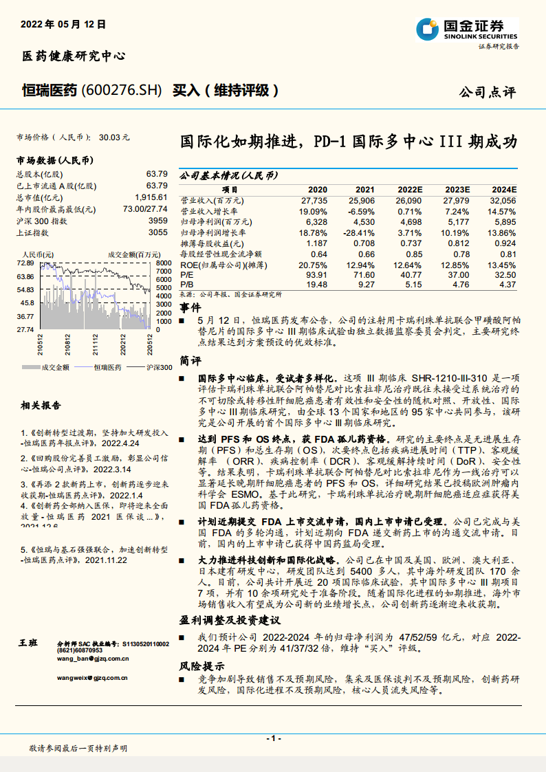 恒瑞医药(600276):国际化如期推进,PD-1国际多中心III期成功