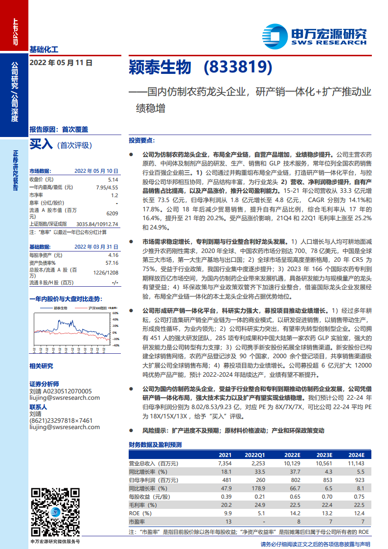 颖泰生物(833819):国内仿制农药龙头企业,研产销一体化+扩产推动业绩稳增