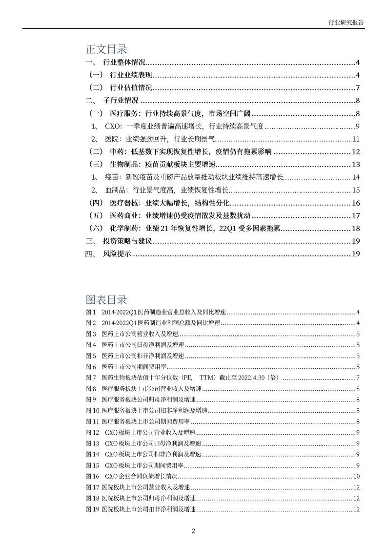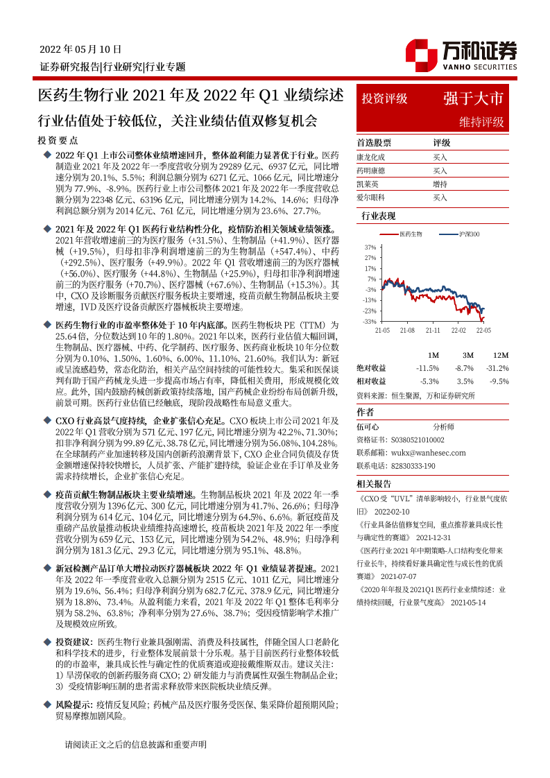 医药生物行业2021年及2022年Q1业绩综述:行业估值处于较低位,关注业绩估值双修复机会