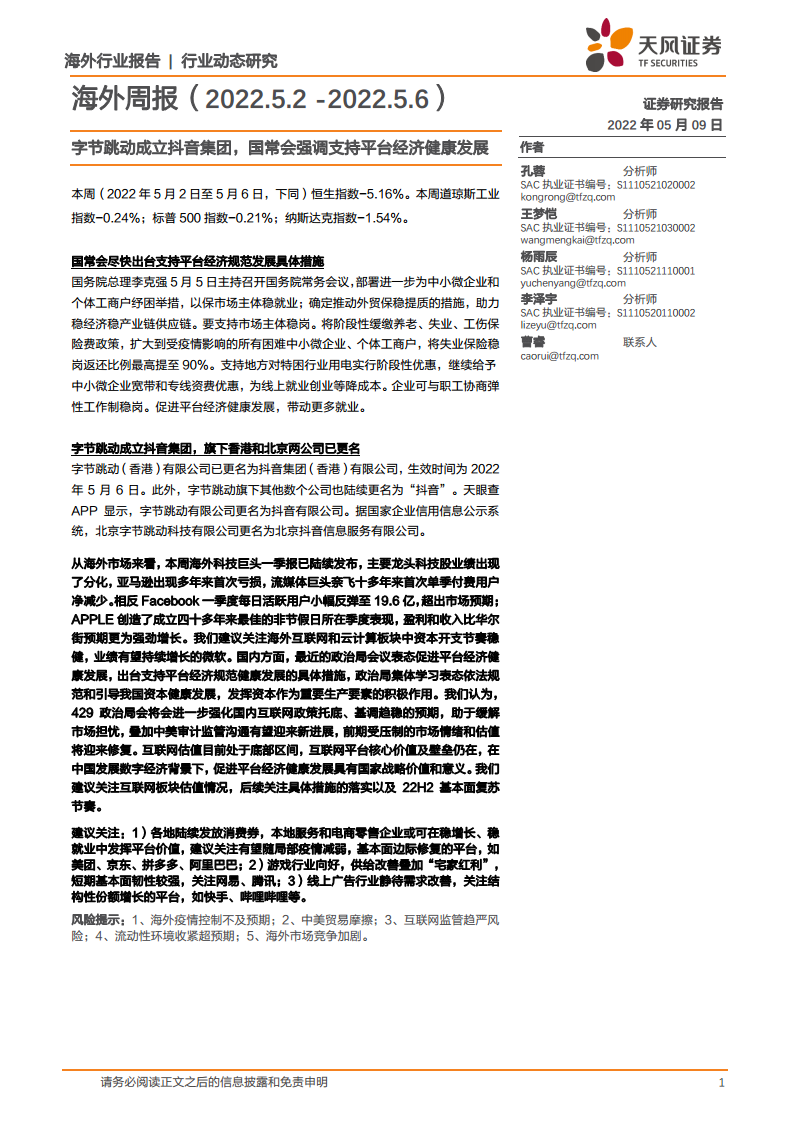 海外周报:字节跳动成立抖音集团,国常会强调支持平台经济健康发展