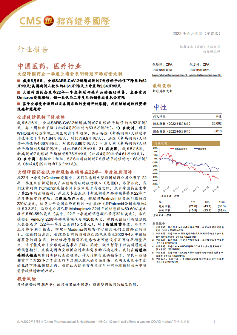 中国医药、医疗行业:大型跨国药企一季度业绩会表明新冠市场前景走弱