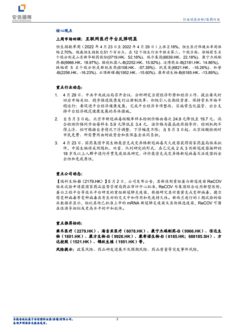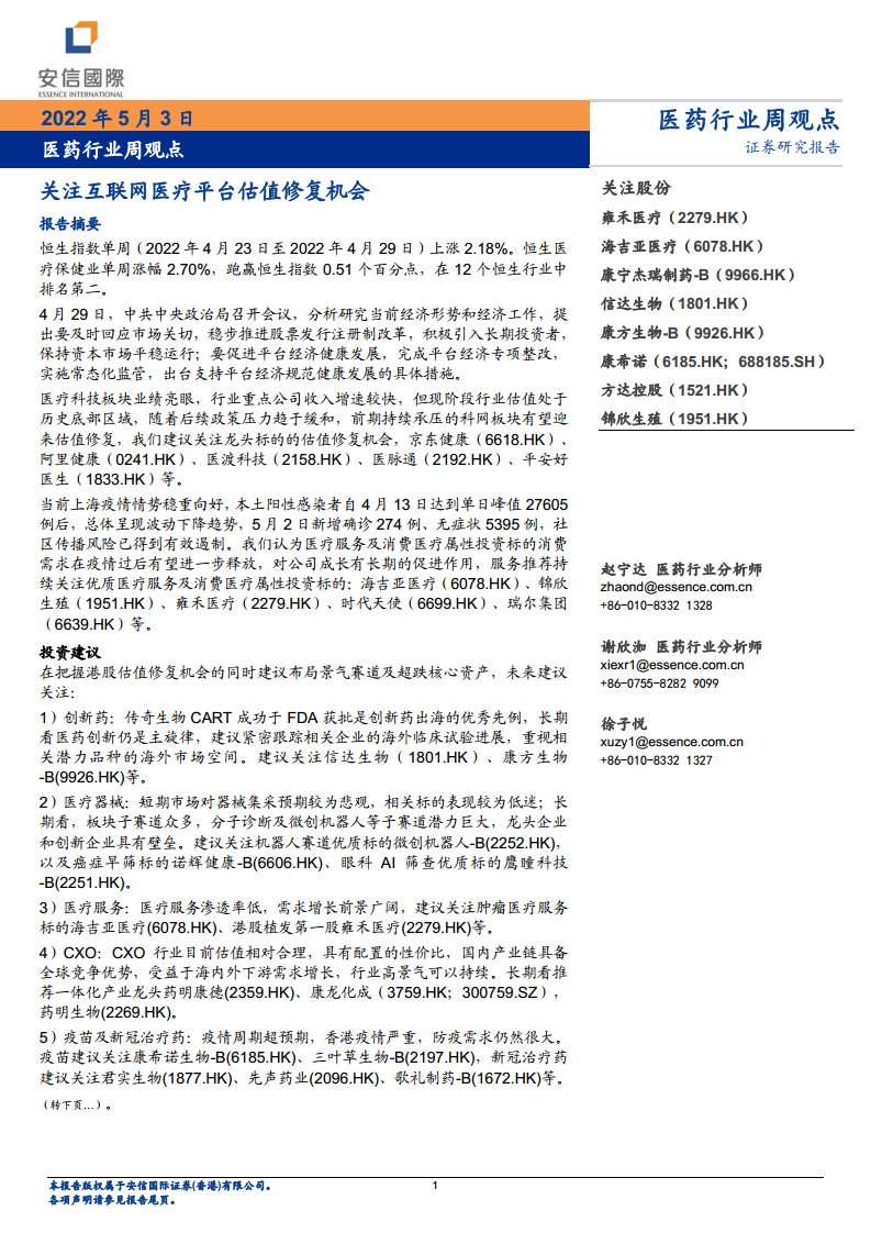 医药行业周观点:关注互联网医疗平台估值修复机会